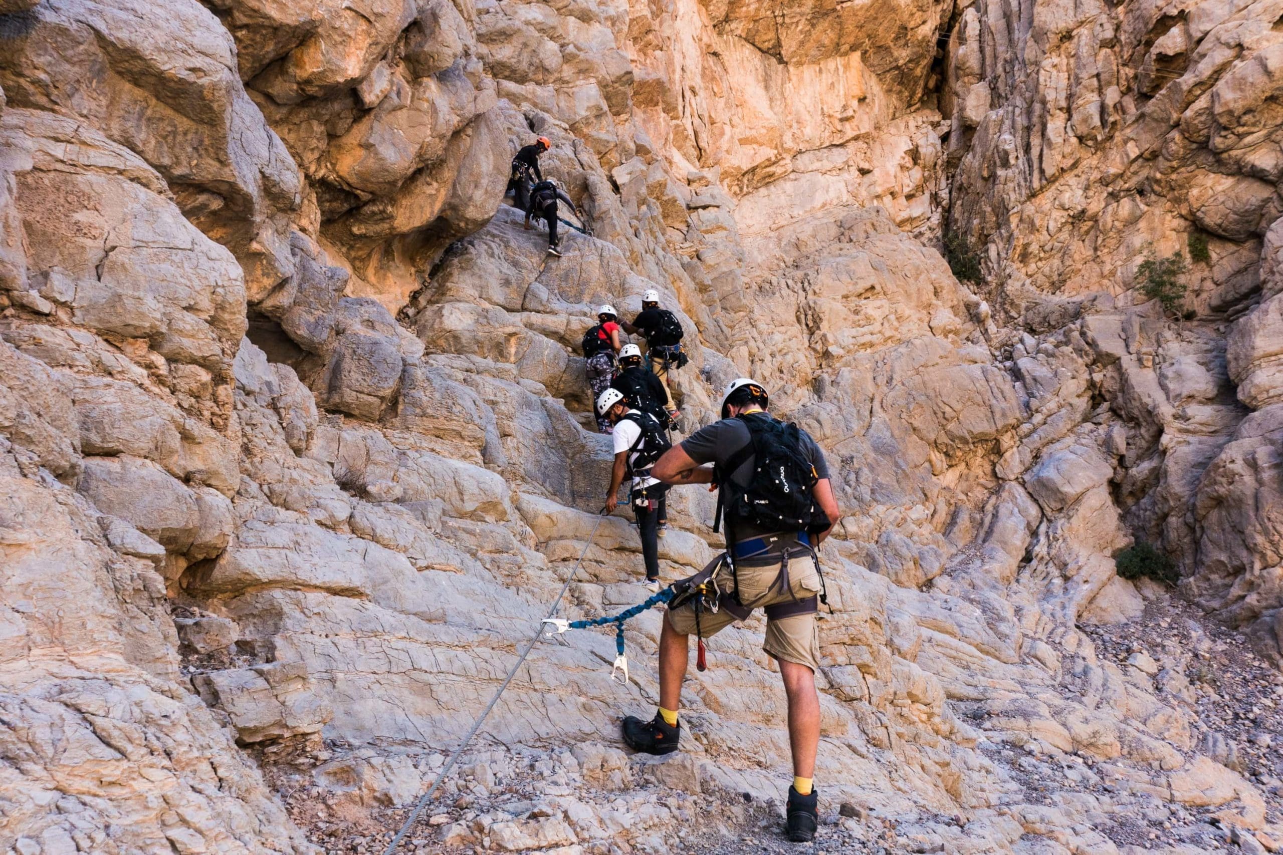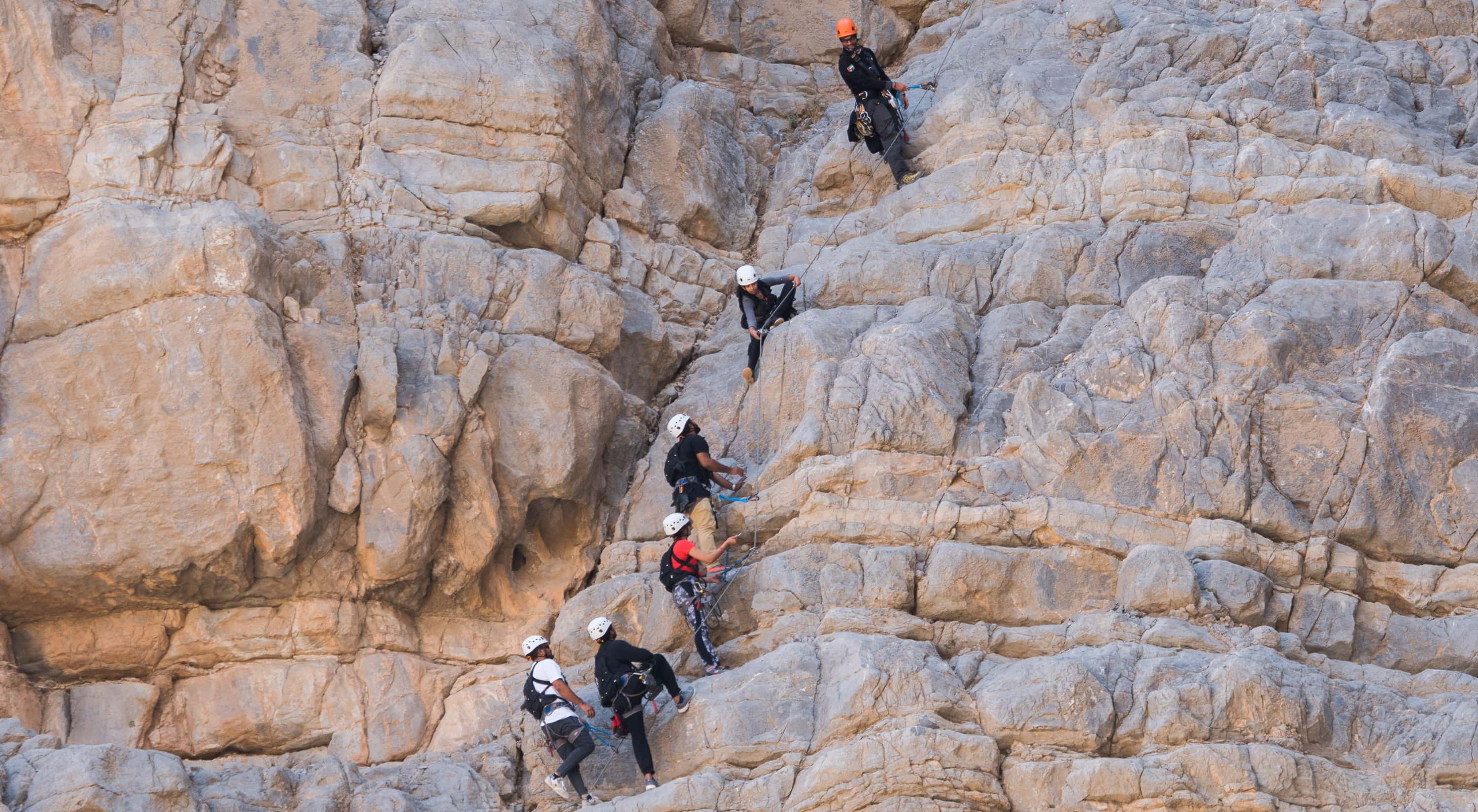 Via Ferrata is Italian for ‘iron path’ and is an exhilarating climb for all levels of mountaineering. The 470-metre (over 30-storeys) Via Ferrata gives you the opportunity of scaling a breathtaking part of the protected rugged Hajar Mountain range. The course runs over three mountain hikes that connect with a series of zip wires measuring 50, 60 and 300 metres. Ras Al Khaimah Tourism Development Authority has worked in partnership with The Warrior Groupย to provide a unique adrenaline activity for you.