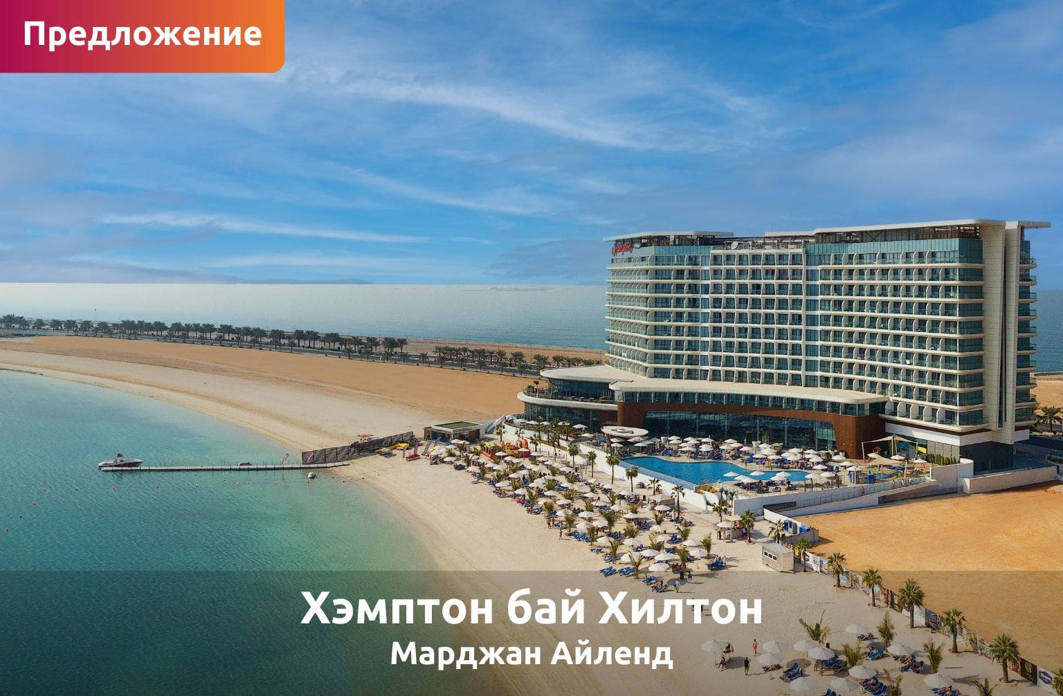 В отеле Хэмптон бай Хилтон Марджан Айленд действует специальная стоимость на проживания с завтраком. Жители ОАЭ могут воспользоваться возможностью раннего заезда в 12:00 и позднего выезда до 16:00 (с понедельника по четверг), а также получить скидку 20% на питание в некоторых ресторанах и 50% на спа-процедуры. Дети в возрасте до 11,99 лет проживают и питаются бесплатно (до 2 детей).